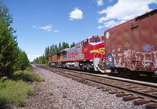 The freight grinds by, into the pine forests and rocky volcanic
