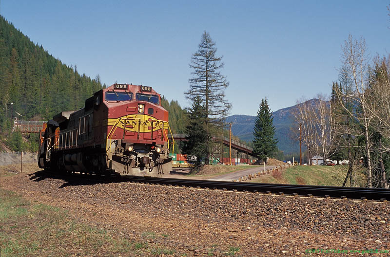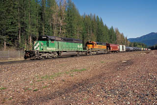 | Just down the road at the Goat Lick, an eastbound crosses Sheeps Creek Trestle. |
