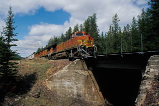 Late in the day, an eastbound led by a set of BNSF C44s crosses Dickey Creek. |